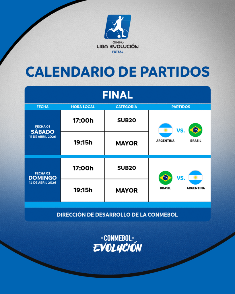 A CONMEBOL Liga Evolução de Futsal 2025 realizará sua final nos dias 11 e 12 de abril, no Estádio Jaraguá, na cidade de Jaraguá do Sul, Santa Catarina, Brasil, onde as seleções nacionais da Argentina e do Brasil se enfrentarão pelo título continental nas categorias Sub-20 e Adulta.