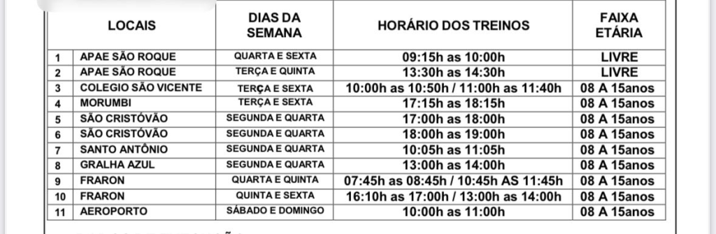 Confira a programação dos dias, horários e locais dos treinos dos polos sociais do Pato Futsal: