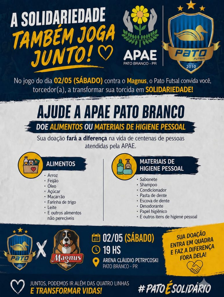 Em mais um gesto de responsabilidade social, o Pato Futsal vai promover a campanha de arrecadação de alimentos não-perecíveis e produtos de higiene pessoal para APAE Pato Branco. As doações poderão ser realizadas na Arena Cláudio Petrycoski, neste sábado (02), no dia da partida contra o Magnus, às 19h, pela Liga Nacional de Futsal 2026. As caixas personalizadas da APAE estarão distribuídas nos portões de acesso da Arena.