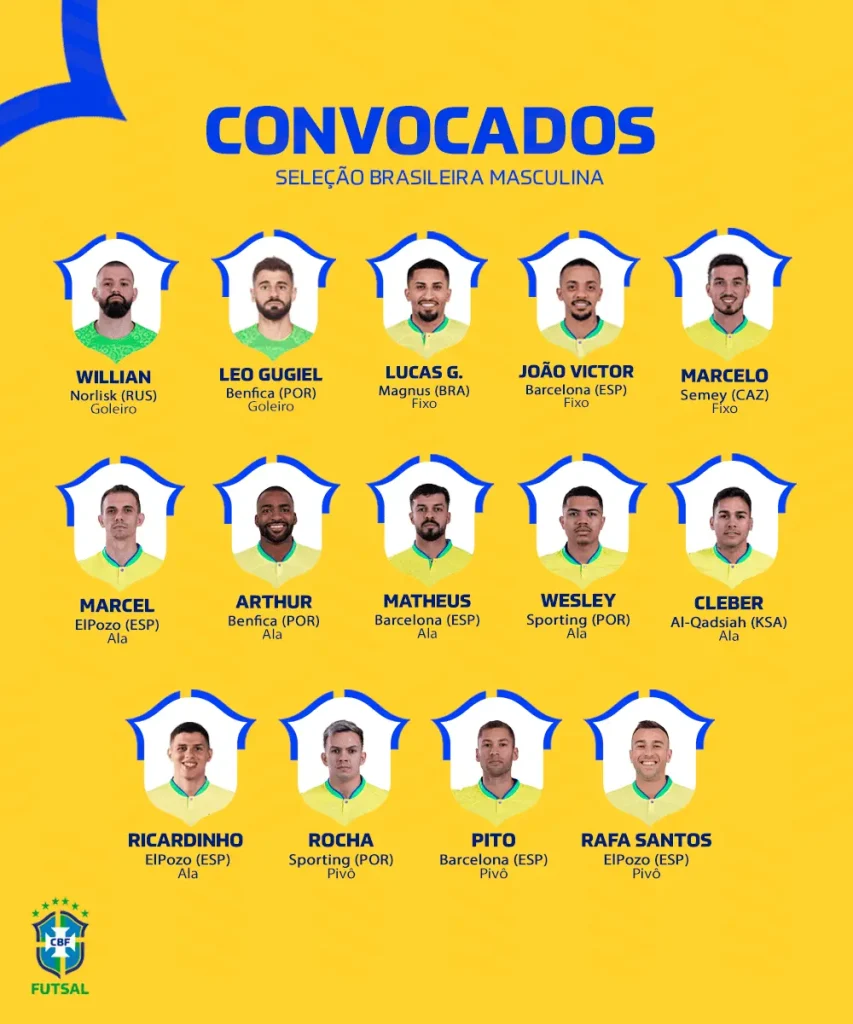 A Seleção Brasileira de Futsal está convocada para os amistosos internacionais contra o Japão, que acontecem nos dias 17 e 19 de outubro. A lista com os 14 atletas foi divulgada nesta quinta-feira (2) pelo técnico Marquinhos Xavier.